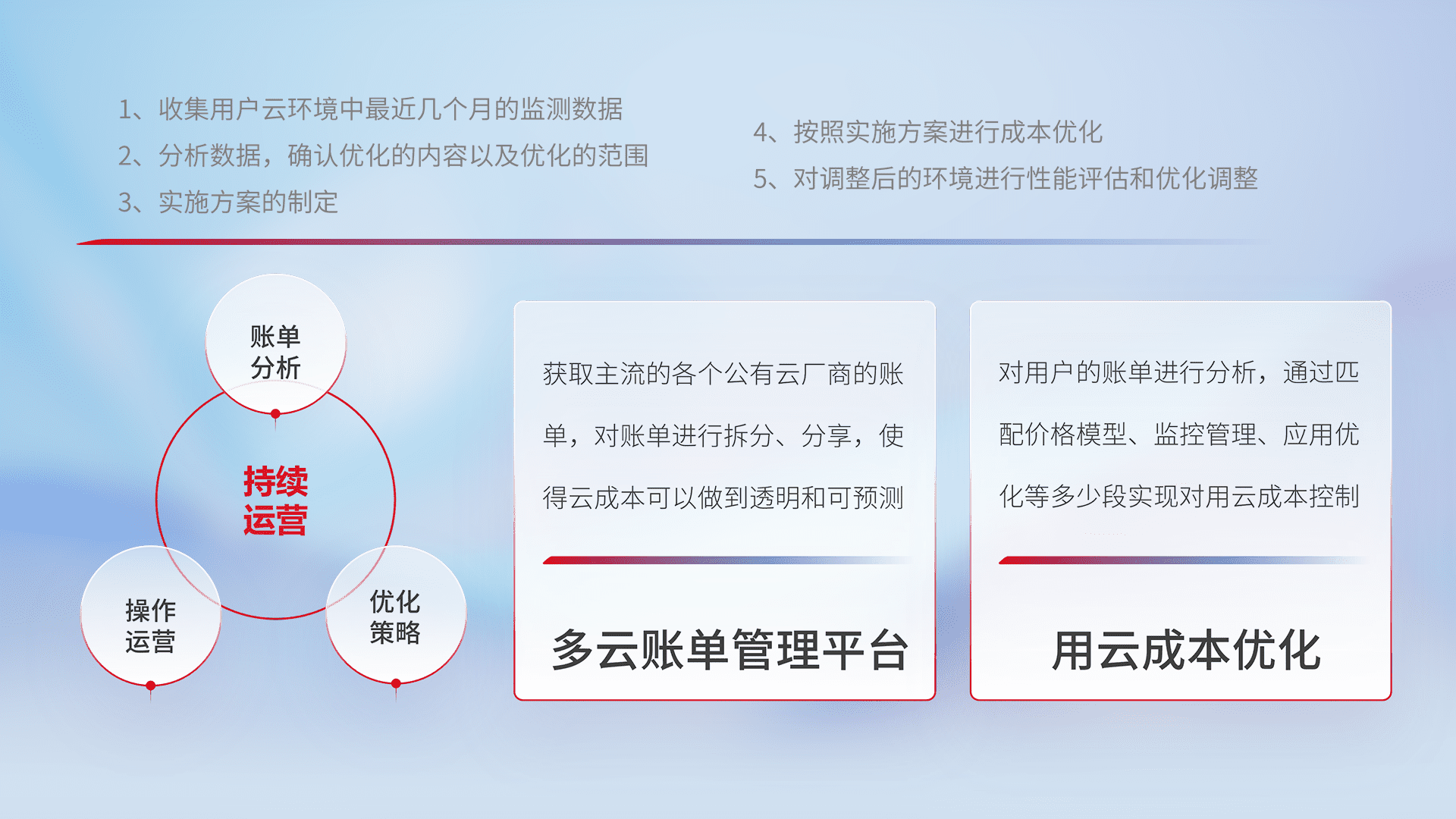 通过多云纳管,,,以统一的资源数据模型把客户的云资源进行抽象和封装,,,,进而实现对多云资源的统一操作,,,保障云资源管理的可靠性、、、、稳定性与可用性。。。。量身定制化运维内容,,配置、、、开发运维、、、、补丁管理、、备份、、监控、、、认证和访问管理、、、审计和日常巡检等,,,,保障在用云过程中的可靠度,,,稳定度以及高可用率。。。。